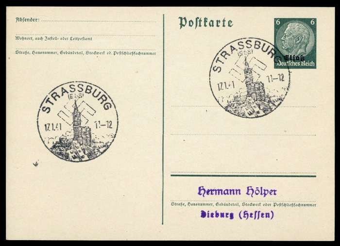 "STRASSBURG 17.1.41", 2 x Hakenkreuz-SST auf phil. 6 Pfg. Hindenburg-Ganzsache