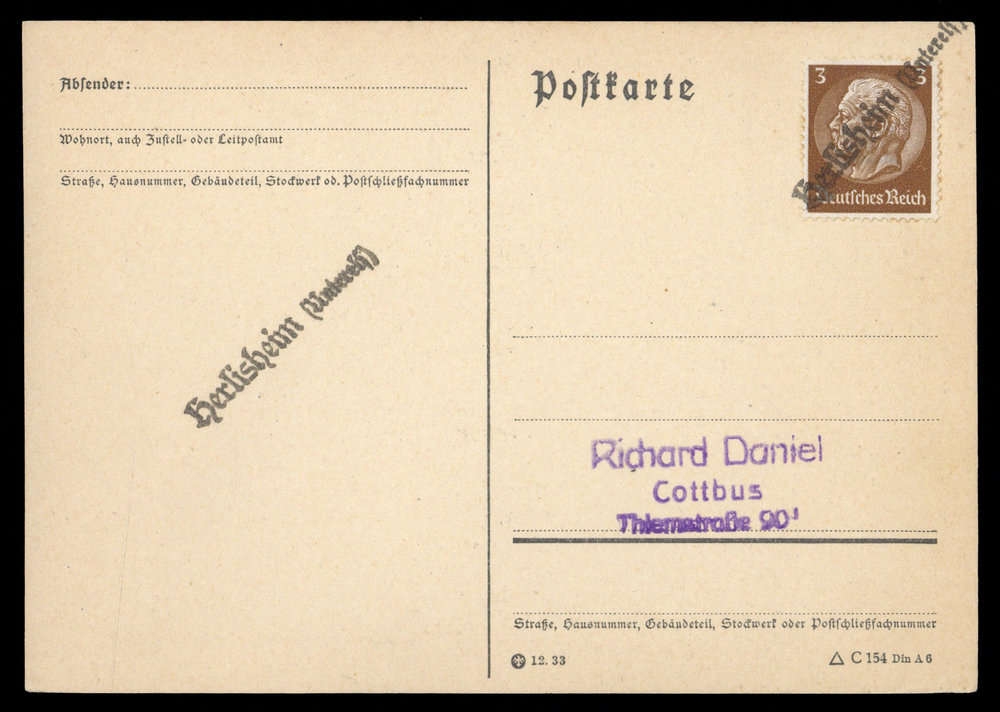 "HERLISHEIM (NIEDERELS)", L1 auf phil. Karte mit 3 Pfg. Hindenburg DR, leichte Alterungsspuren