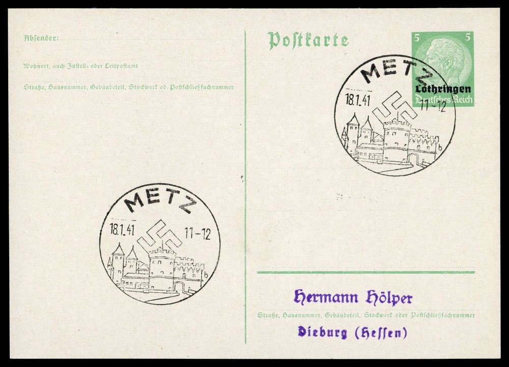 "METZ 18.1.41", Hakenkreuz-SST 2 x auf phil. 5 Pfg. Hindenburg-Ganzsache