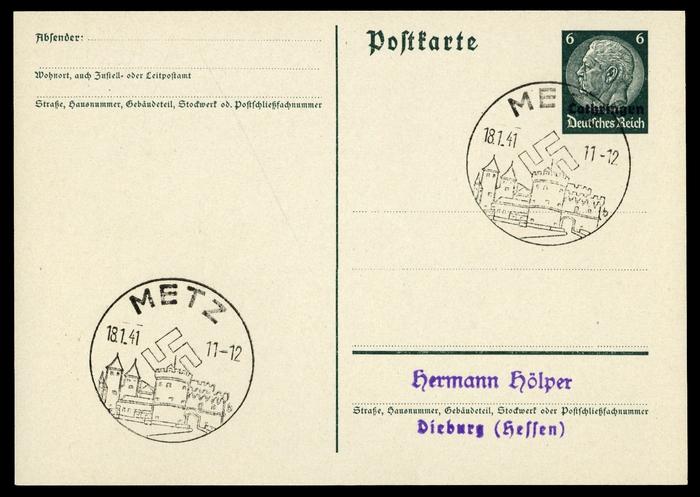 "METZ 18.1.41", Hakenkreuz-SST 2 x auf phil. 6 Pfg. Hindenburg-Ganzsache