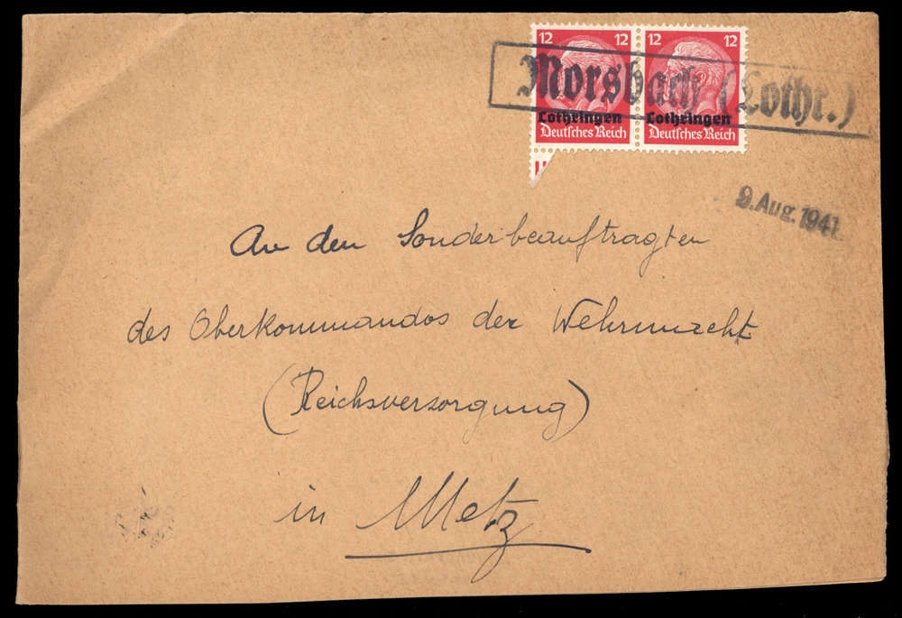 "MORSBACH (LOTHR.)", Ra und "9. Aug. 1941" auf Bedarfsbrief mit 2 x 12 Pfg. Hindenburg nach Metz