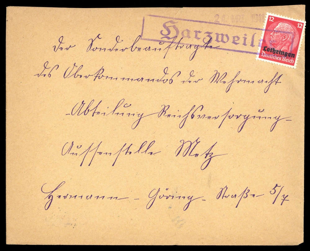 "HARZWEILER", violetter Ra und "24. Mrz 1941" auf Bedarfsbrief mit 12 Pfg. Hindenburg nach Metz, Beförderungsspuren
