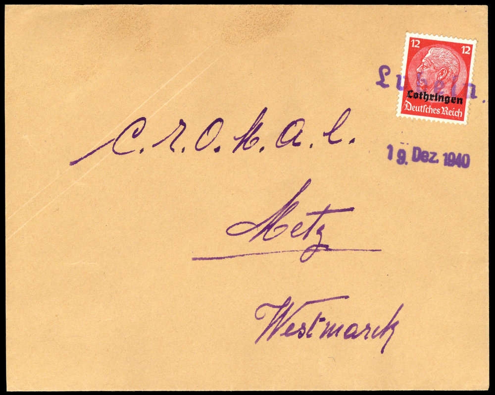 "LUBELN", violetter L1 und "19. Dez 1940" auf Bedarfsbrief mit 12 Pfg. Hindenburg nach Metz