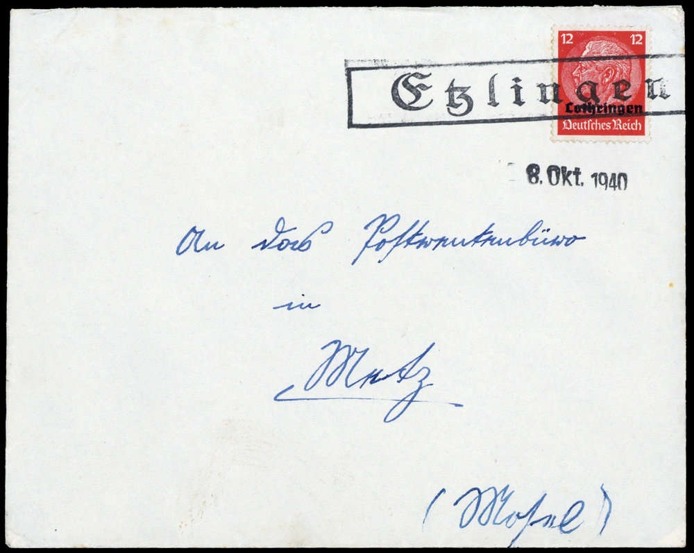 "ETZLINGEN", langer Ra und "8. Okt 1940" auf Bedarfsbrief mit 12 Pfg. Hindenburg nach Metz