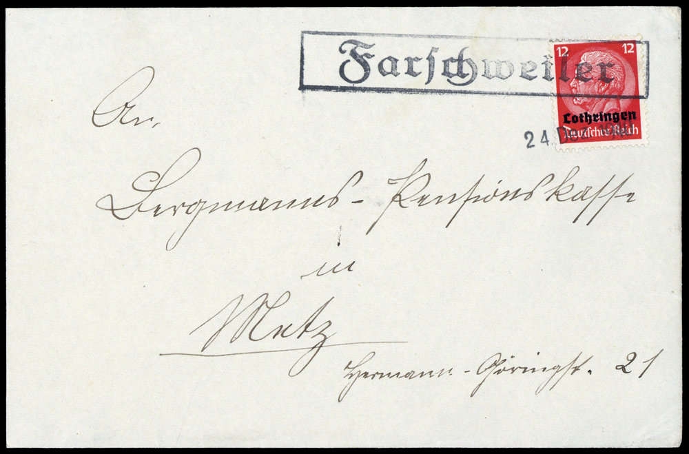 "FARSCHWEILER", Ra und "24 Dez 1940" auf Bedarfsbrief mit 12 Pfg. Hindenburg nach Metz