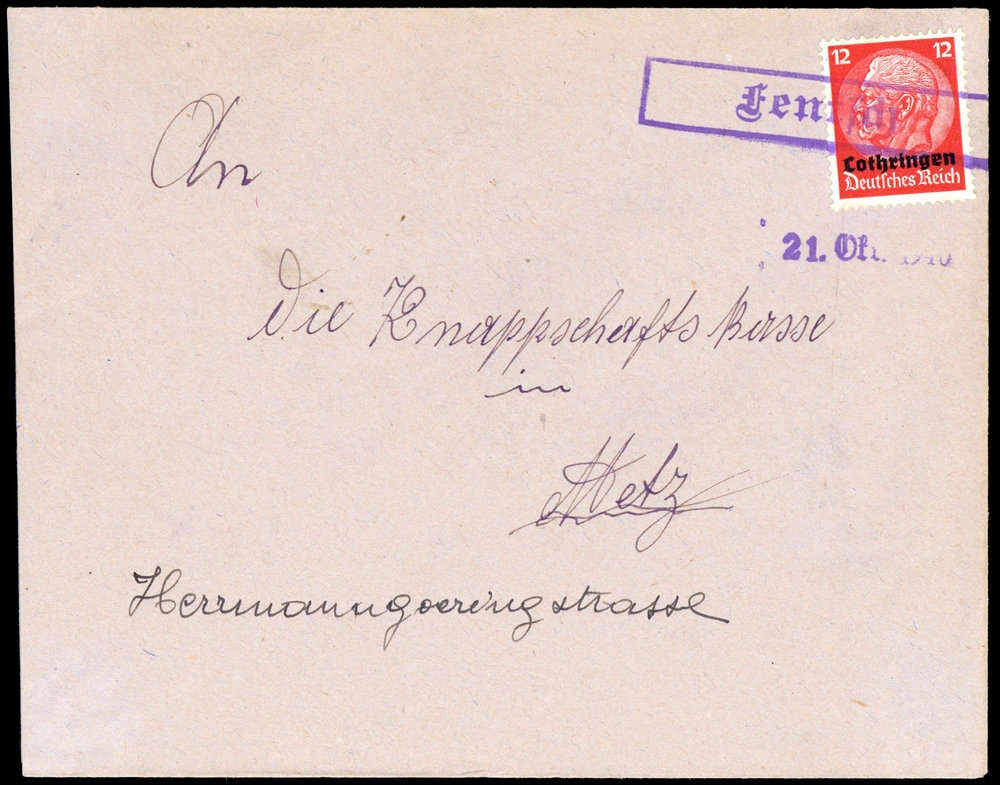 "FENTSCH", violetter Ra und "21 Okt 1940" auf Bedarfsbrief mit 12 Pfg. Hindenburg nach Metz