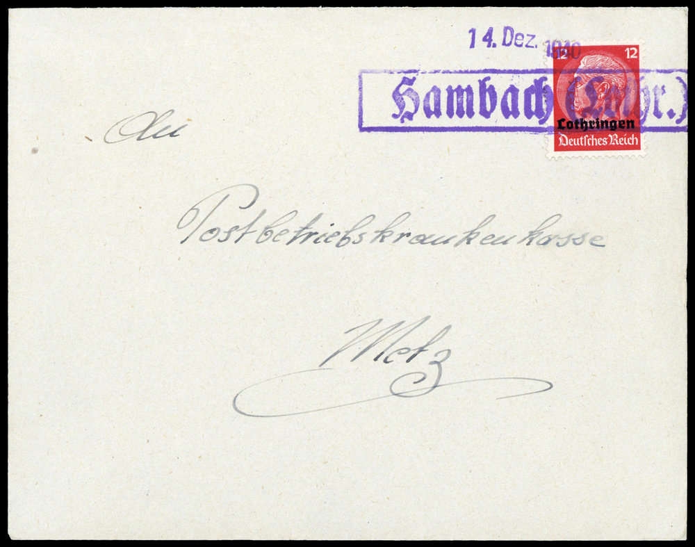 "HAMBACH (LOTHR.)", violetter Ra und "14 Dez 1940" auf Bedarfsbrief mit 12 Pfg. Hindenburg nach Metz