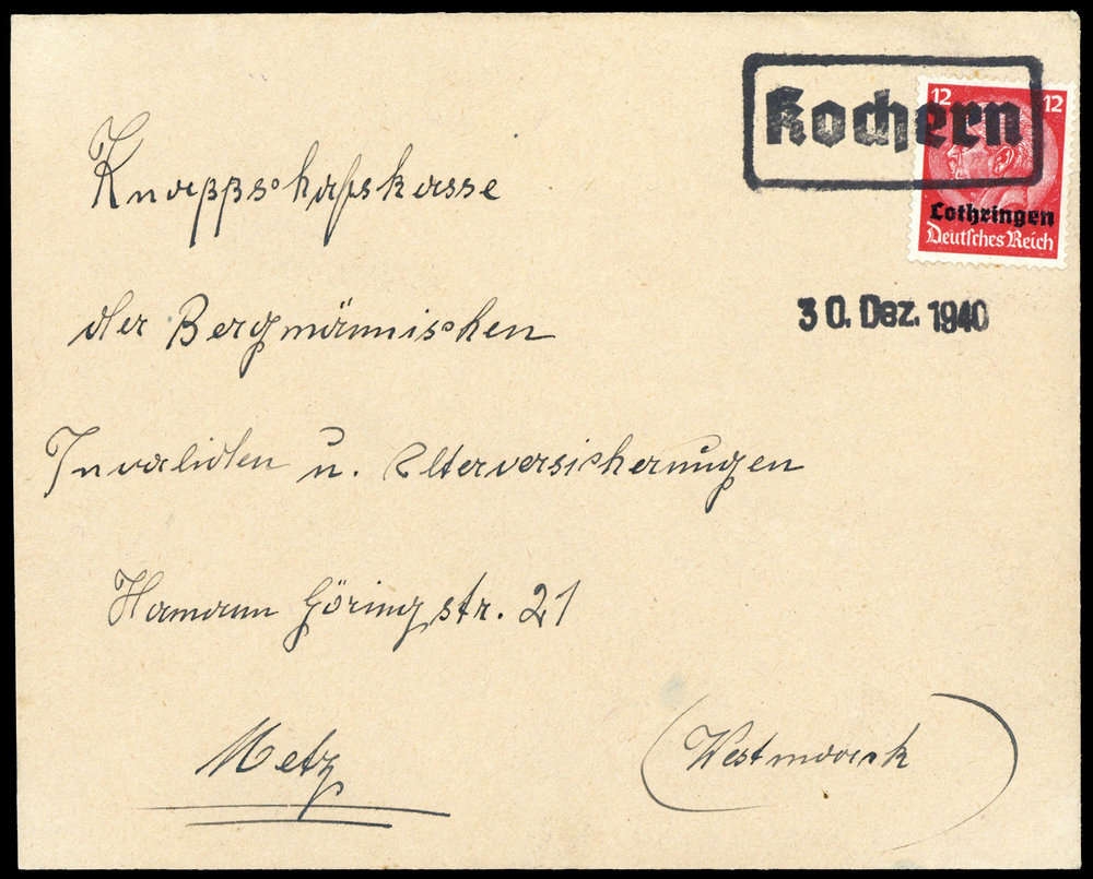 "KOCHERN", Ra und "30. Dez. 1940" auf Bedarfsbrief mit 12 Pfg. Hindenburg nach Metz