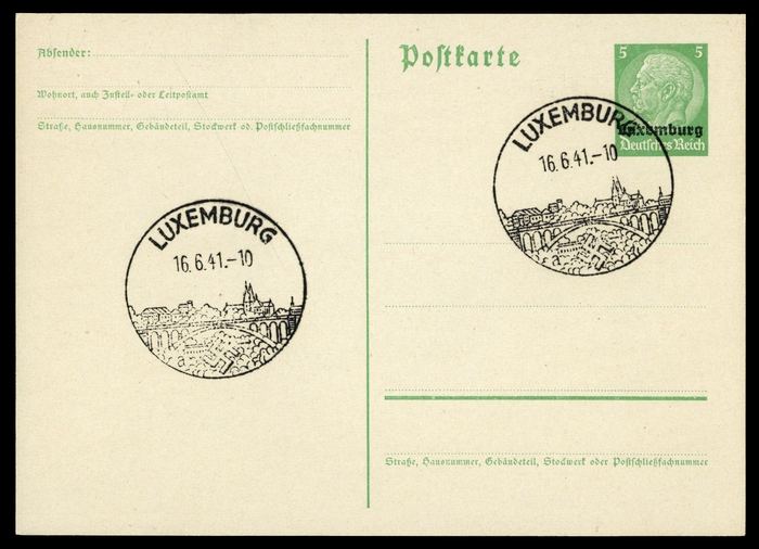 "LUXEMBURG 16.6.41", Hakenkreuz-SST 2 x auf 5 Pfg. Hindenburg-Ganzsache