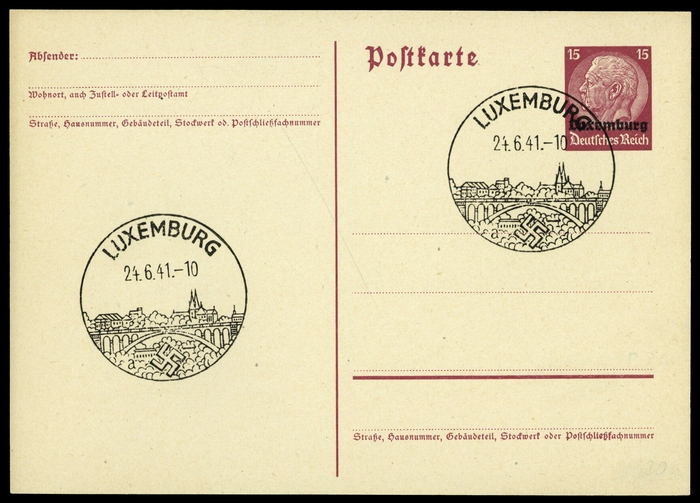 "LUXEMBURG 24.6.41", Hakenkreuz-SST auf 15 Pfg. Hindenburg-Ganzsache