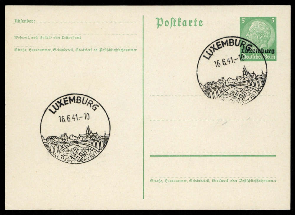 "LUXEMBURG 16.6.41", Hakenkreuz-SST auf 5 Pfg. Hindenburg-Ganzsache