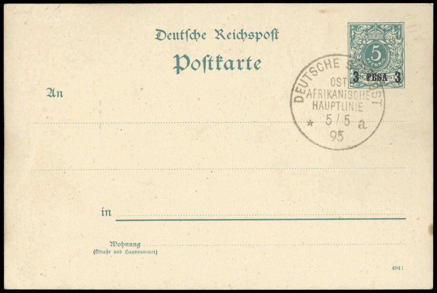 "DEUTSCHE SEEPOST OST-AFRIKANISCHE HAUPTLINIE 5/5 95 a" auf P1 Blanko- Ganzsache, leichte Randalterungsspuren.