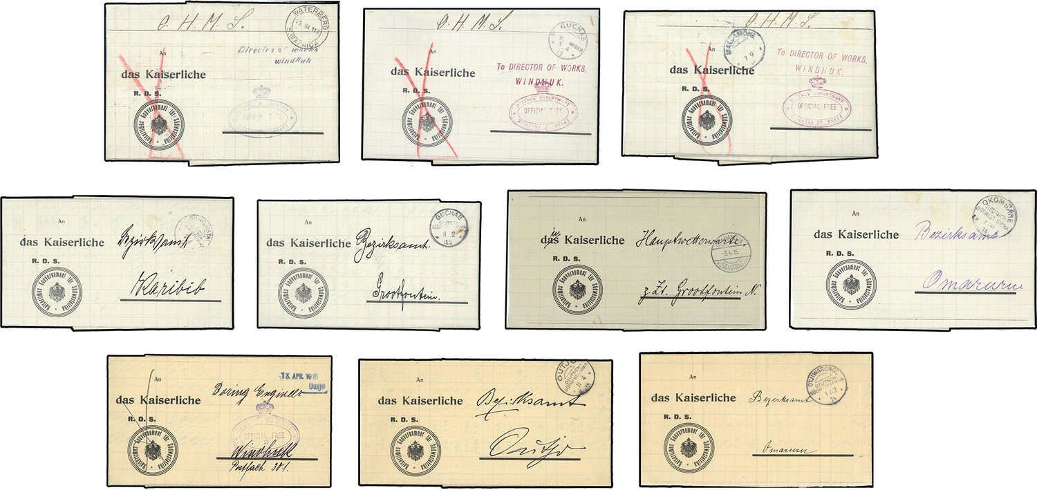 DEUTSCH-SÜDWESTAFRIKA: Interessante Partie mit zehn Briefen "Reichsdienstsache" mit Meldungen Meteorologischer Monatstabellen aus den Jahren 1914 bis 1919, dabei Maltahöhe, Wilhelmstal, Outjo, Otjiwarongo, Okombahe, 2 x Guchab, Okahandja, blauer L2 "13. April 1916 Outjo" und K2 "Waterberg 15. Jul 18 S.W.AFRIKA"