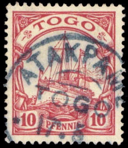 "ATAKPAME TOGO 17.5", blauer Stempel auf 10 Pfg. Schiffszeichnung, unregelmäßige Zähnung, gepr. Steuer BPP (im Arge-Stempelkatalog nicht gelistet)