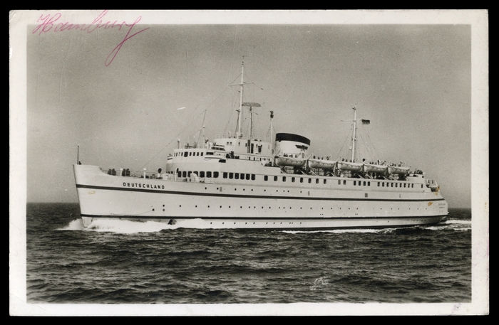 "Deutschland" Fährschiff, Fotokarte mit 10 Pfg. Heuss, 1955