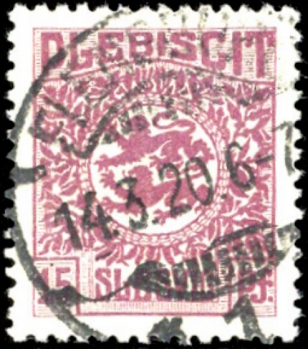"FLENSBURG 14.3.20" als Teilabschlag auf 15 Pfg. Wappen, übliche Zähnung (Gruber D2 06.11 E, 240 Punkte)