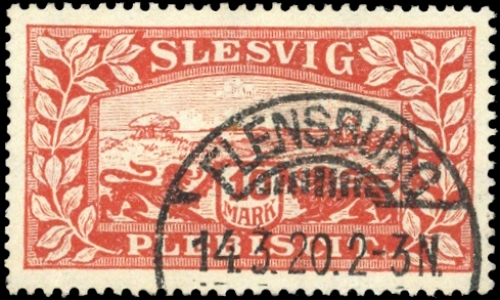 "FLENSBURG 14.3.20" als Teilabschlag auf 10 Mark Wappen, unregelmäßige Zähnung (Gruber D2 06.11 E, 240 Punkte)