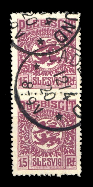 "LADELUND 12.4.20" als Teilabschlag auf 15 Pfg. Wappen als senkrechtes Paar (Gruber D2 018.0 B, 90 Punkte)