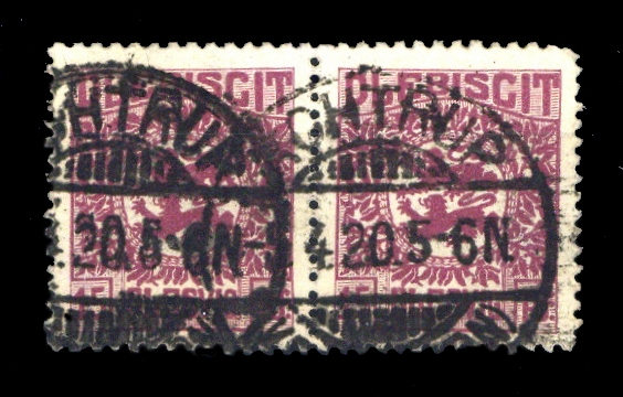 "ACHTRUP 5.4.20" als 2 Teilabschläge auf 15 Pfg. Wappen als waagerechtes Paar, Zahnfehler (Gruber D2 01.0 E, 160 Punkte)