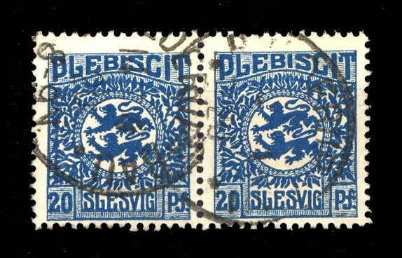 "BÜLDERUP - BAU 14.4.20" als 2 Teilabschläge auf 20 Pfg. Wappen als waagerechtes Paar (Gruber D1 016.0 B, 60 Punkte)