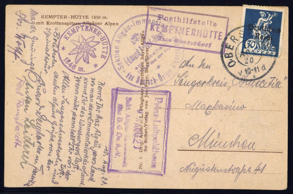 "Posthilfsstelle KEMPTNERHÜTTE Taxe Oberstdorf" als violetter Ra3 auf passender Postkarte mit Nr. 123 (Zahnfehler) von OBERSTDORF 10.8.1920, adressiert nach München, ferner diverse Hüttenstempel, leichte Alterungsspuren.