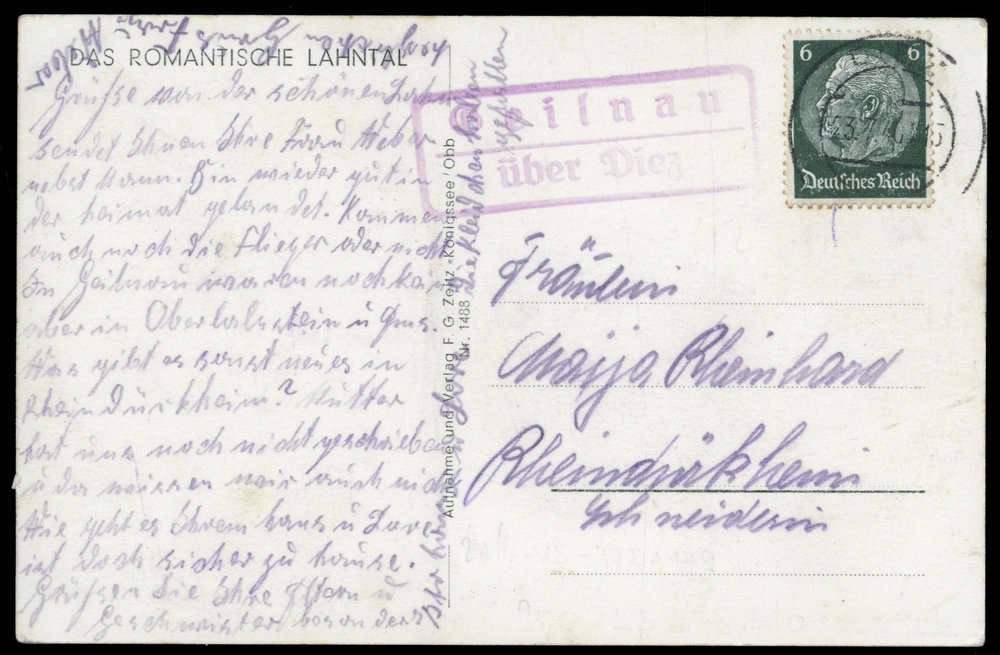 "Geilnau / über Diez" (violett) als Nebenstempel auf Postkarte mit Nr. 516 von DIEZ 23.7.1940 nach Rheindürkheim, Marke leichte Aufklebespuren.