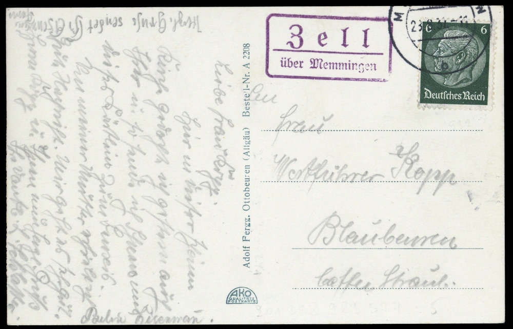 "Zell über Memmingen" (violett) als Nebenstempel auf Postkarte (Ottobeuren) mit Nr. 516 von MEMMINGEN 23.8.1937 nach Blaubeuren.