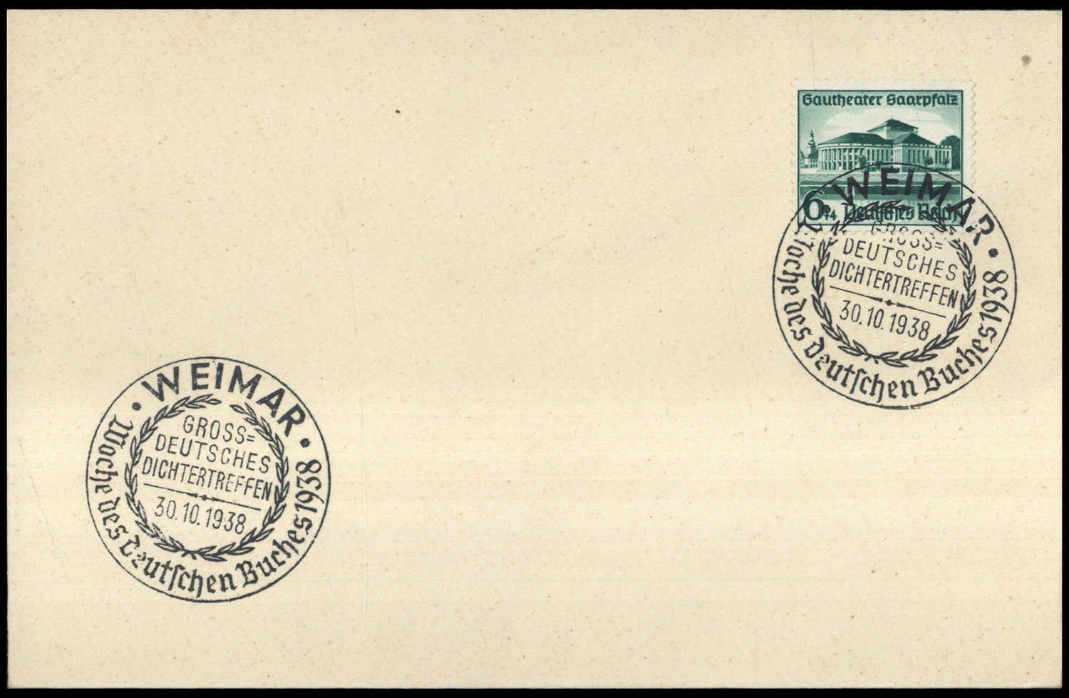 "WEIMAR 30.10.38 WOCHE DES BUCHES", 2 x SST auf Blankobrief mit 6 Pfg. Gautheater
