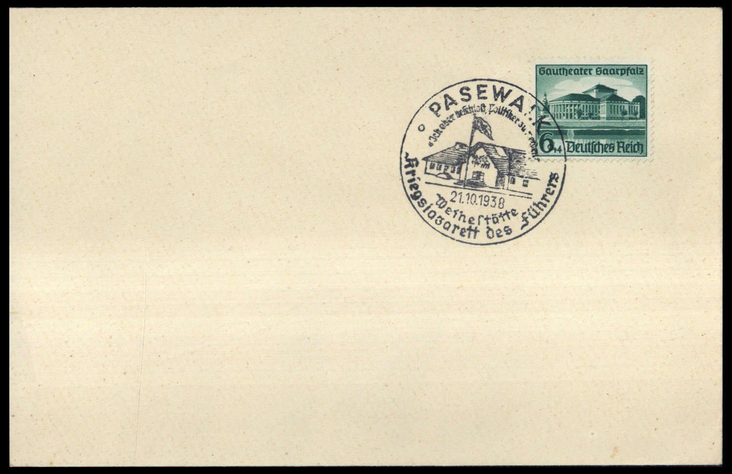 "PASEWALK 21.10.38 KRIEGSLAZARETT DES FÜHRERS", SST auf Blankobrief mit 6 Pfg. Gautheater