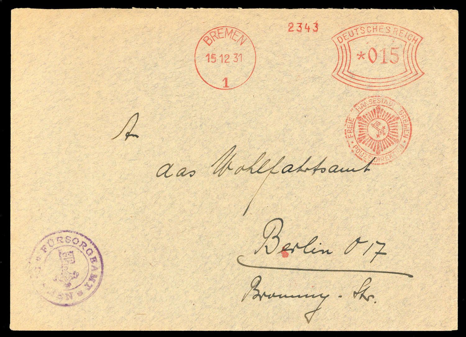 "BREMEN 1 - 15.12.1931 - POLIZEIDIREKTION - DEUTSCHES REICH *015" (rot) auf Brief nach Berlin O17, nebengesetzt violetter Briefstpl. "Fürsorgeamt", links senkrechter Bug, leichte Randalterungsspuren.