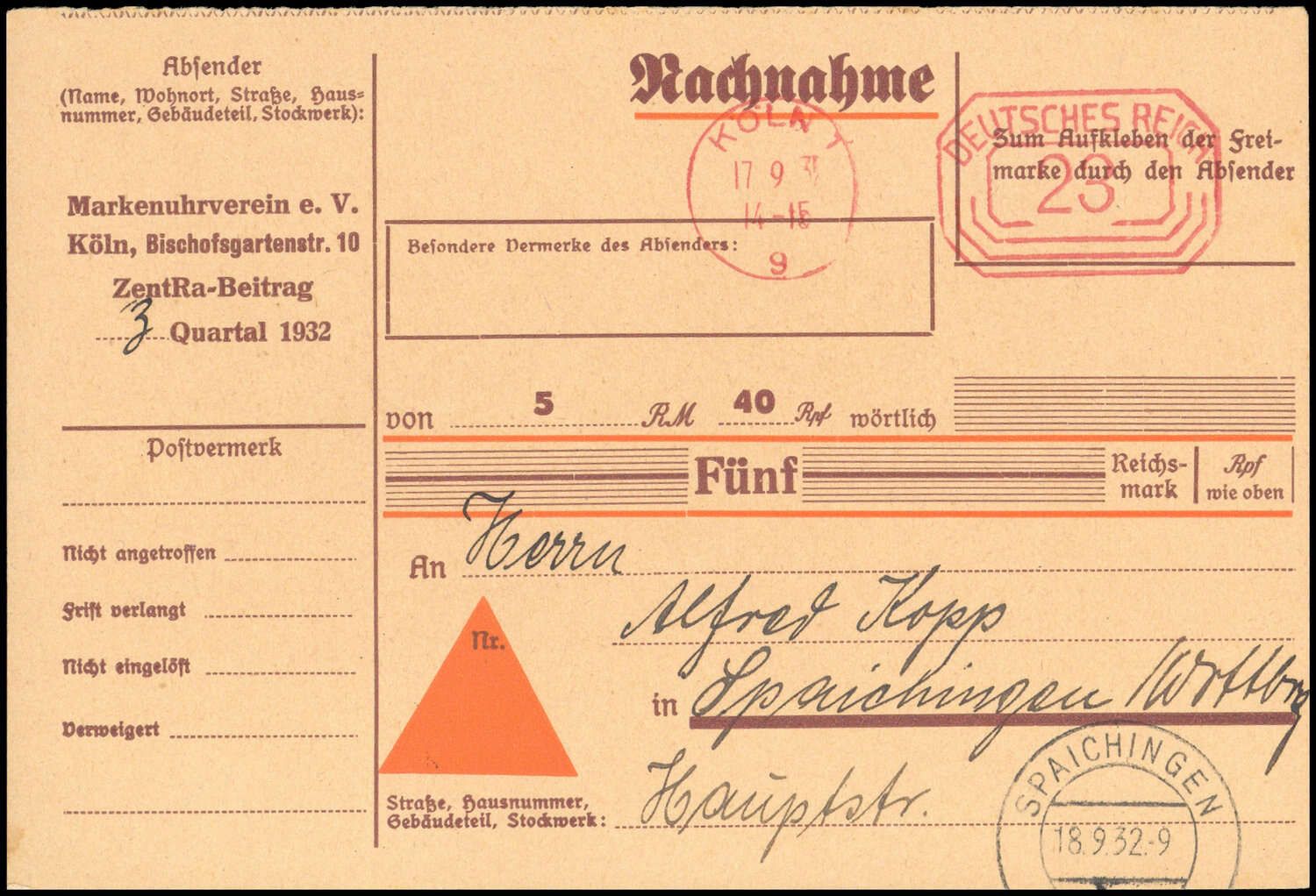 "KÖLN 1 - 17.9.1932 - DEUTSCHES REICH 23" (rot) auf vorgedruckter NACHNAHME-Karte (Markenuhrverein e.V.) nach Spaichingen mit Ankunftsstpl.