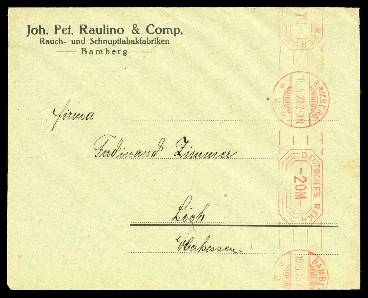 "BAMBERG 2 - 15.5.1923 - DEUTSCHES REICH 20M" (rot) als Maschinenstempel auf Firmen-Brief (Rauch- und Schnupftabakfabriken) nach Lich / Oberhessen, leichte Spuren.