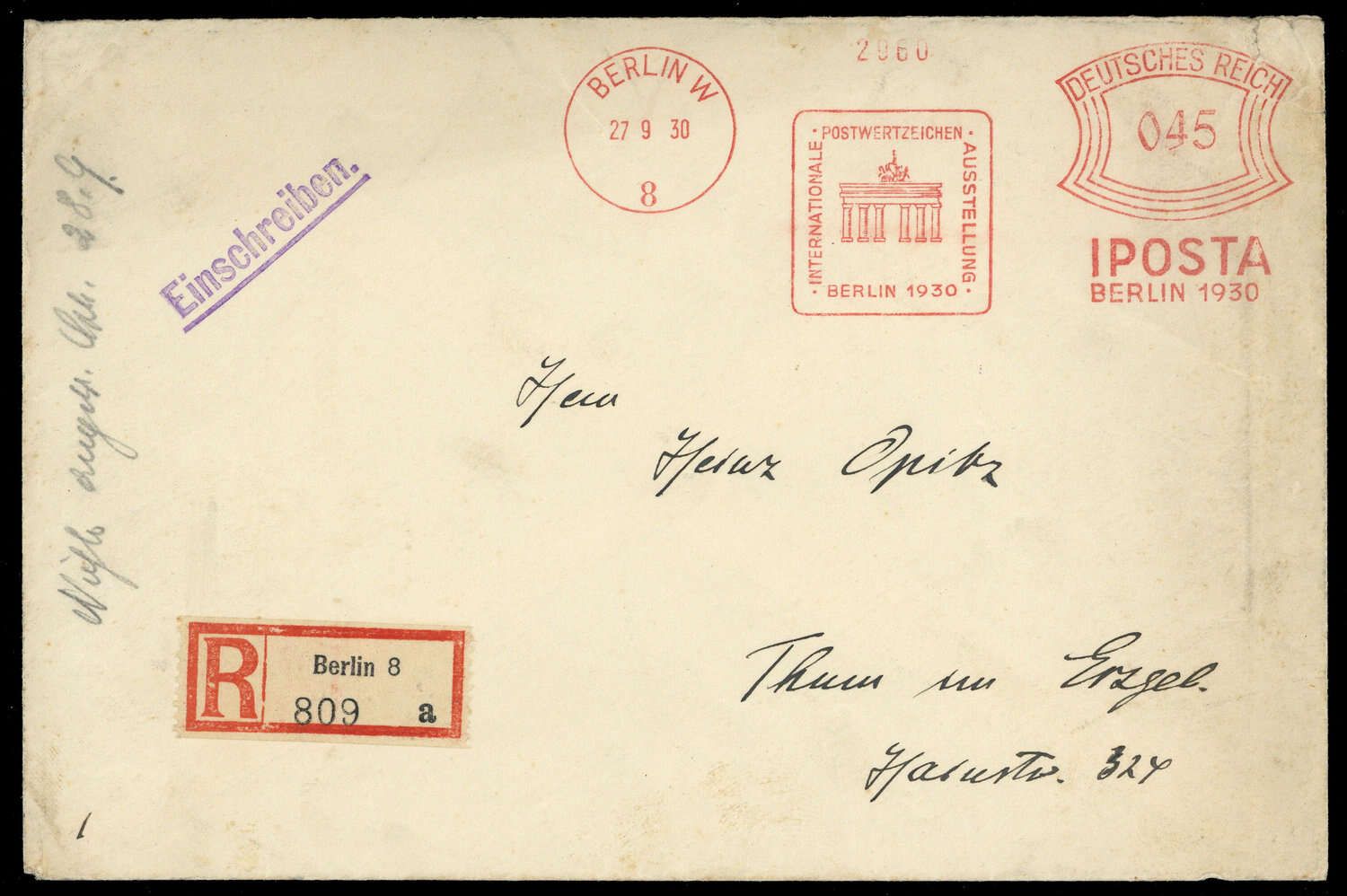 "BERLIN W8 - 27.9.1930 - IPOSTA BERLIN 1930 - DEUTSCHES REICH 045" (rot) auf R-Brief nach Thun, rückseitig violetter Absendermehrzeiler "Internationale Postwertzeichen-Ausstellung Berlin 1930", etwas größeres Kuvert, Alterungs- und Randspuren.