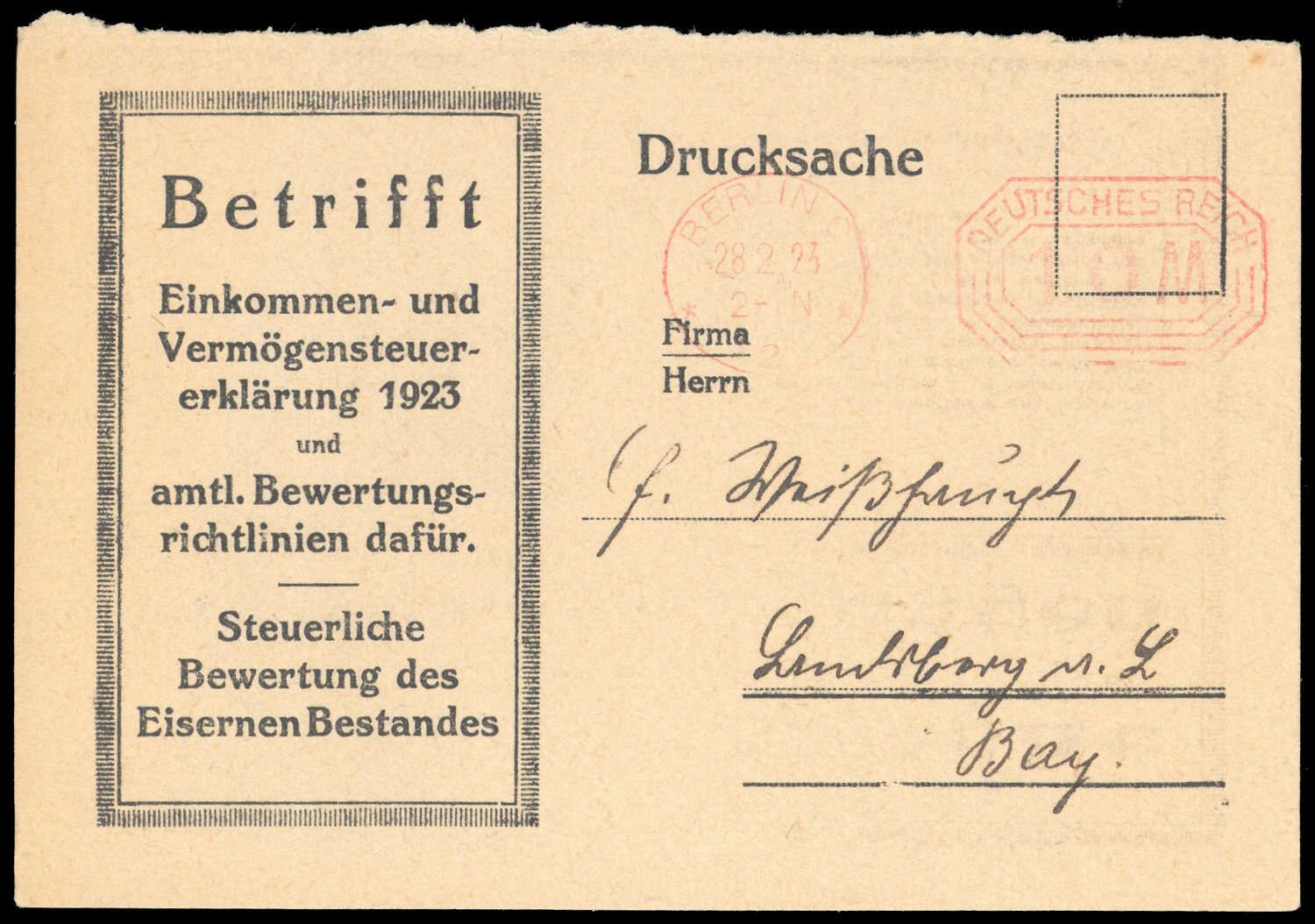 "BERLIN C2 - 28.2.1923 - DEUTSCHES REICH 10M" (rot) auf vorgedruckter Firmen-Drucksache (Steuererklärungen) nach Landsberg / Lech, leichte Randspuren.