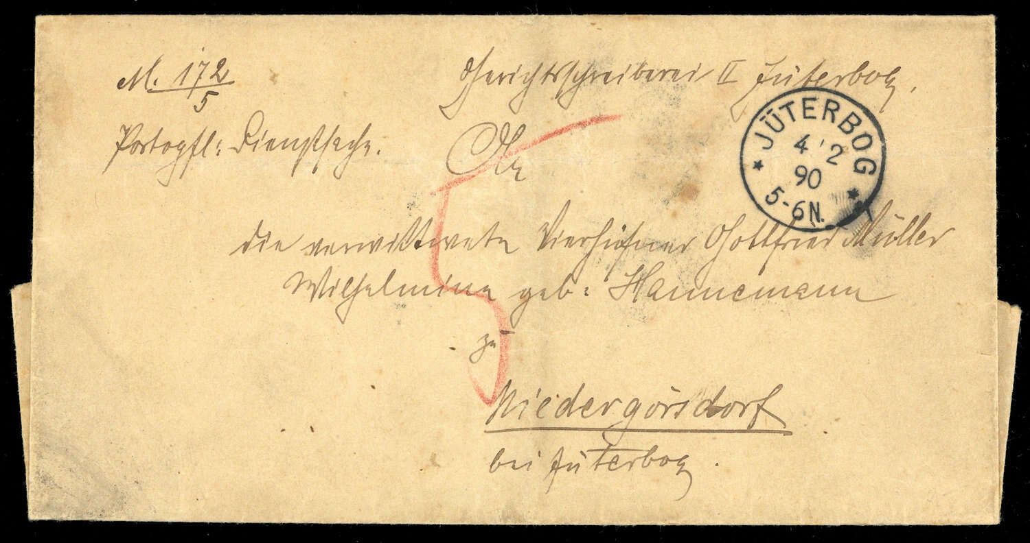 "JÜTERBOG 4/2 1890" (K1) auf Faltbrief (Portopflichtige Dienstsache) nach Niedergörsdorf, hds "5", rs. Briefstpl., senkrechter Mittelbug, Alterungsspuren.