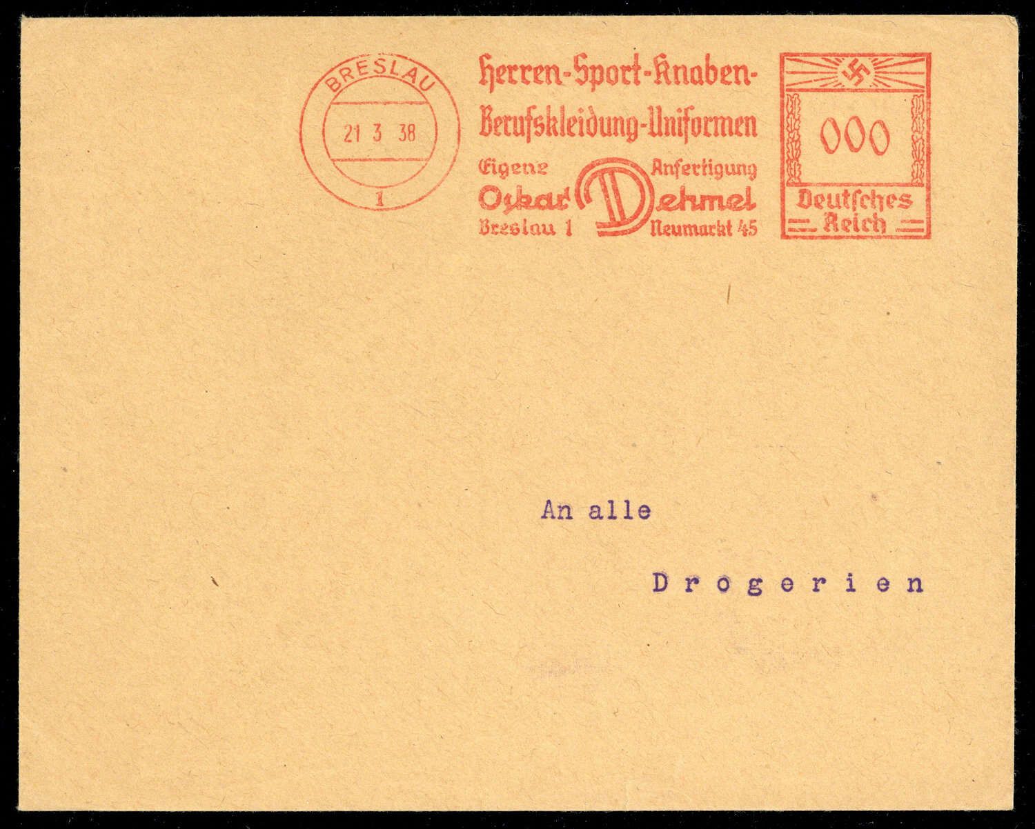 "BRESLAU 21.3.1938 - BERUFSKLEIDUNG UNIFORMEN OSKAR DEHMEL - 000 Deutsches Reich" (rot) auf Brief, adressiert "An alle Drogerien", Musterabschlag.