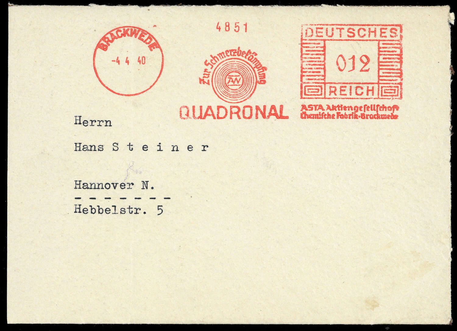 "BRACKWEDE 4.4.1940 - QUADRONAL ASTA AG CHEMIE - 012 DEUTSCHES REICH" (rot) auf stark beschnittenem Firmen-Brief, adressiert nach Hannover, links leichter senkrechter Bug, dreiseitig geöffnet.