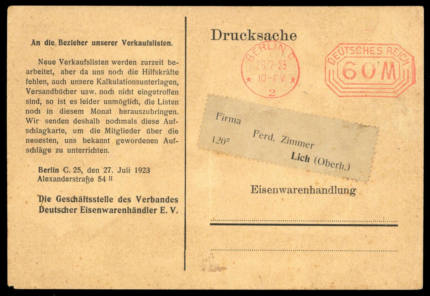 "BERLIN C2 - 28.7.1923 - DEUTSCHES REICH 60M" (rot) auf vorgedruckter Firmen-Drucksache(Deutscher Eisenwarenhändler E.V.) nach Lich / Oberhessen, leichte Alterungsspuren.