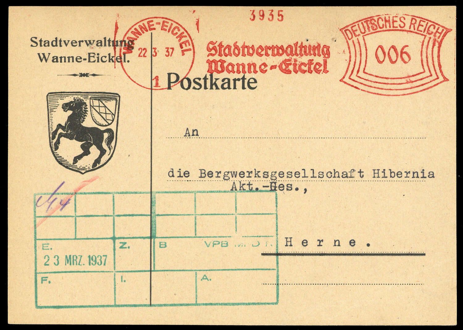 "WANNE-EICKEL 1 - 22.3.1937 - STADTVERWALTUNG - DEUTSCHES REICH 006" (rot) auf Stadtverwaltungs-Postkarte nach Herne, grüner Eingangsstpl., kleine Nadellöcher, leichte Spuren.