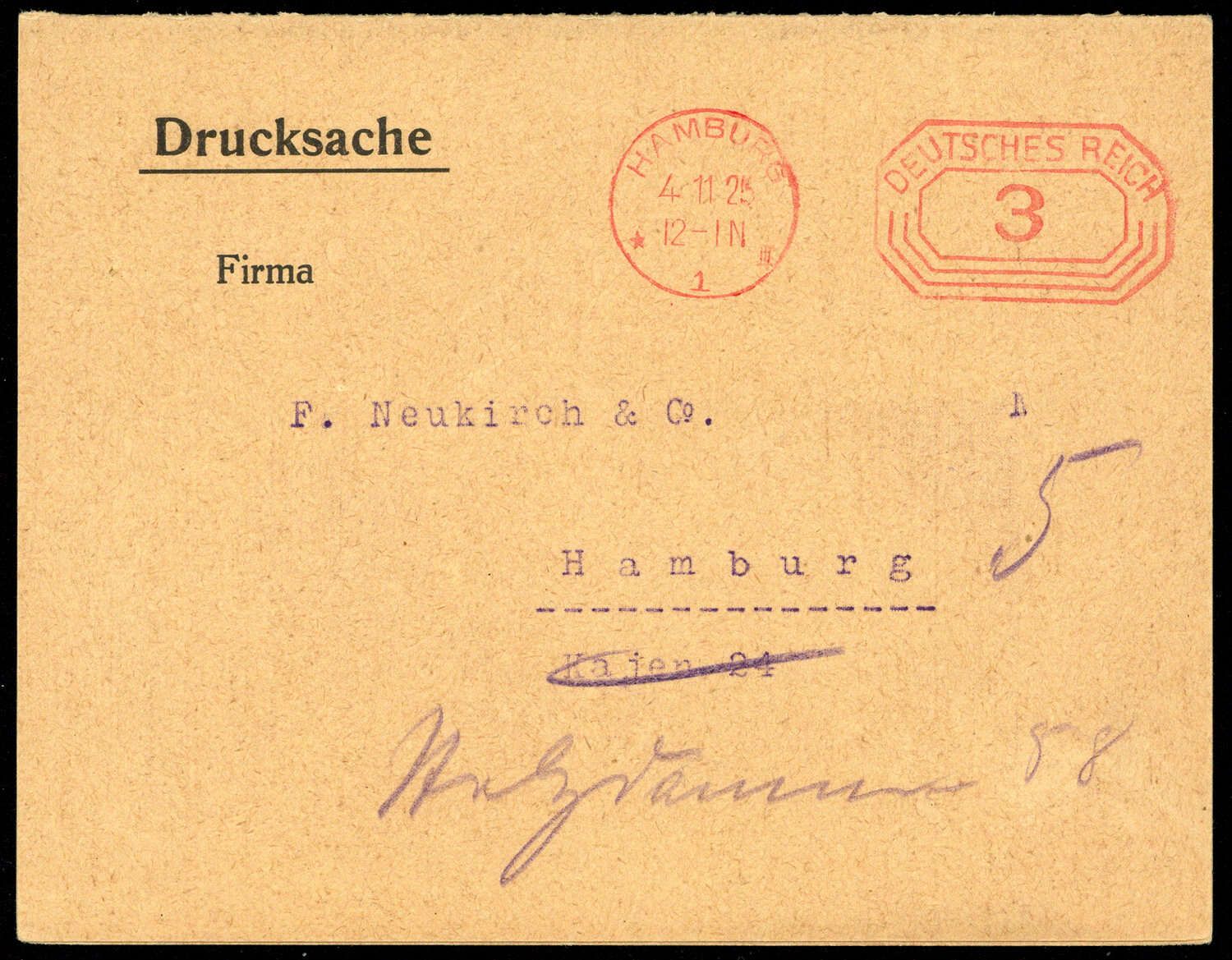 "HAMBURG 1 - 4.11.1925 - DEUTSCHES REICH 3" (rot) auf vorgedruckter FIRMEN-DRUCKSACHE (Klappkarte / Osaka Shosen Kaisha - Japanische Dampfschiffahrts-Gesellschaft Konferenz-Linie) nach Hamburg mit hds. Weiterleitungsvermerken, violetter rs. Eingangsstpl., leichte Spuren.