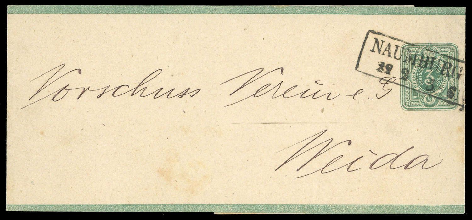 "NAUMBURG 22 2 5.-6.", Ra2 auf 3 Pfge. Ziffer-GA-Streifband nach Weida, leichte Spuren.