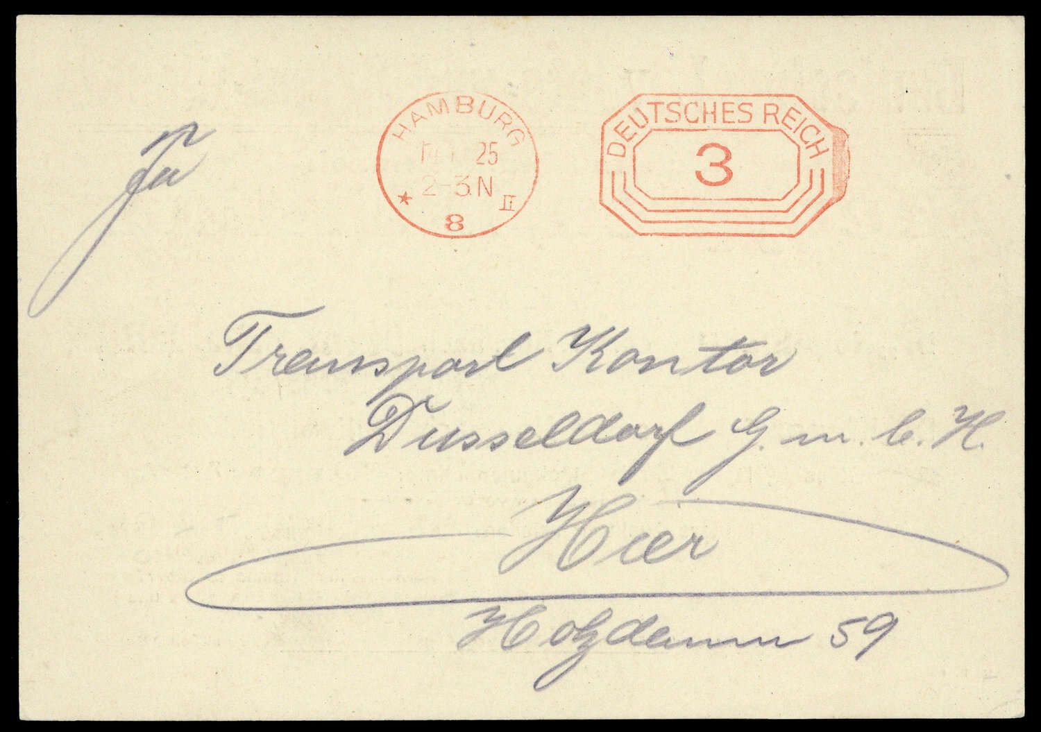 "HAMBURG 14.11.1925 - DEUTSCHES REICH 3" (rot) auf Firmen-Postkarte (Deutscher Levante- und Orient-Dienst / Spielmann & Co.) nach Hamburg, violetter rs. Eingangsstpl.