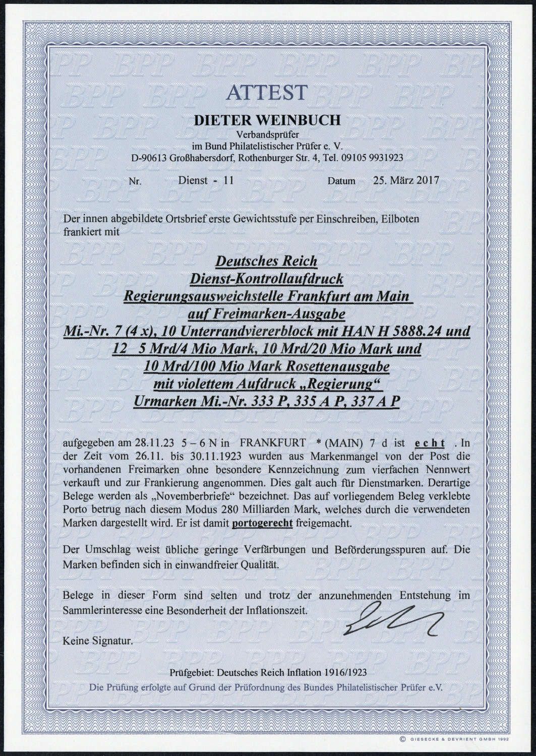 Deutsches Reich Dienst Regierung Frankfurt:1923, 5 Milliarden (MiNr.7 - 4 Stück), 10 Milliarden (MiNr.10 - 4 Stück), 10 Milliarden (MiNr.12 - 1 Stück) Inflationsmarken "Rosettenmuster" alle mit Dienst- Kontrollaufdruck von Frankfurt als portogerechte Mischfrankatur auf Eilboten- Einschreibebrief. Aktuelles Farbfotoattest Weinbuch BPP vom 25.03.2017 "... echt.... Der Umschlag weist übliche geringe Verfärbungen und Beförderungsspuren auf. Die Marken befinden sich in einwandfreier Qualität. Belege in dieser Form sind selten und trotz der anzunehmenden Entstehung im Sammlerinteresse eine Besonderheit der Inflationszeit... ". Das auf dem sogenannten "Novemberbrief" verklebte Porto betrug nach dem damaligen Umrechnungsmodus 280 Milliarden Mark! Bei dem Viererblock mit vollständiger Hausauftragsnummer MiNr.10 (HAN H 5888.23) auf portogerechtem Brief müsste es sich um ein Unikat handeln!