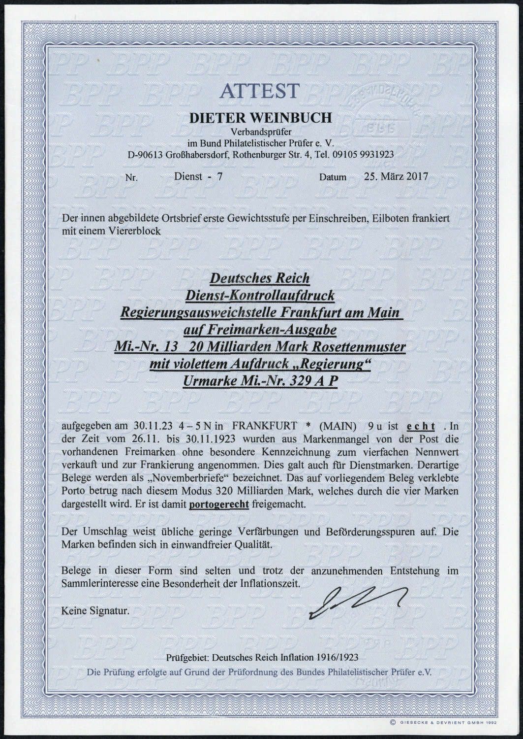 Deutsches Reich Dienst Regierung Frankfurt:1923, 20 Milliarden Inflationsmarke "Rosettenmuster" im außergewöhnlichen 4-er Block mit Dienst- Kontrollaufdruck von Frankfurt als portogerechte Mehrfachfrankatur auf Eilboten- Einschreibebrief, aktuelles Farbfotoattest Weinbuch BPP vom 25.03.2017 "... echt.... Der Umschlag weist übliche geringe Verfärbungen und Beförderungsspuren auf. Die Marken befinden sich in einwandfreier Qualität. Belege in dieser Form sind selten und trotz der anzunehmenden Entstehung im Sammlerinteresse eine Besonderheit der Inflationszeit... ". Das auf dem sogenannten "Novemberbrief" verklebte Porto betrug nach dem damaligen Umrechnungsmodus 320 Milliarden Mark!