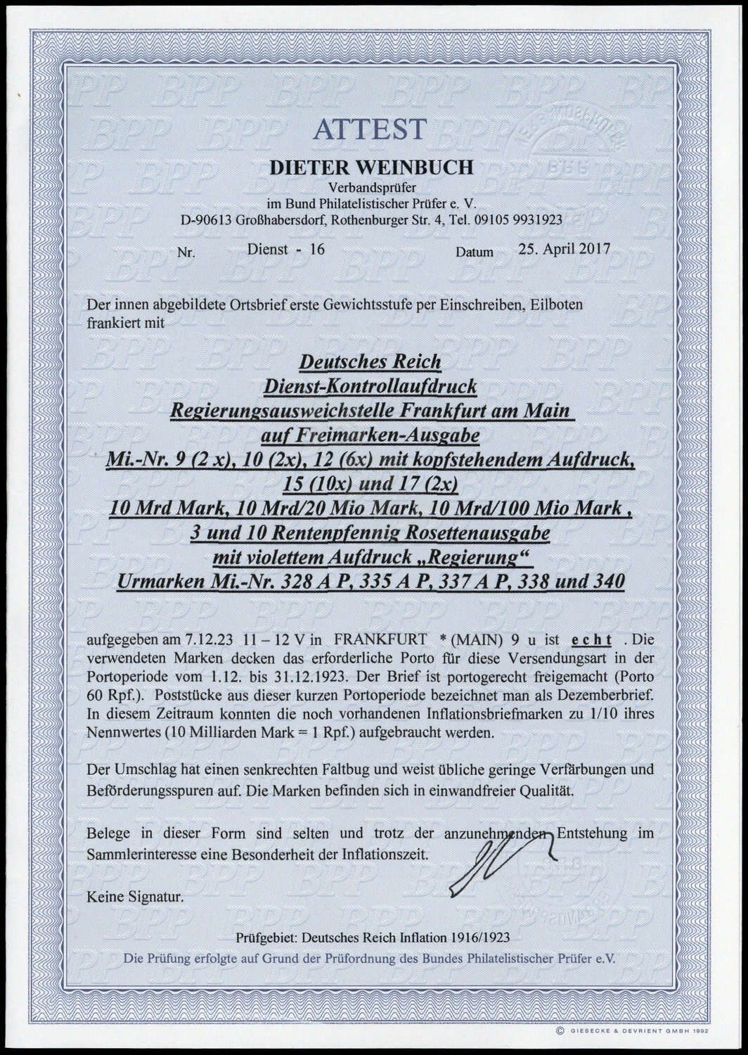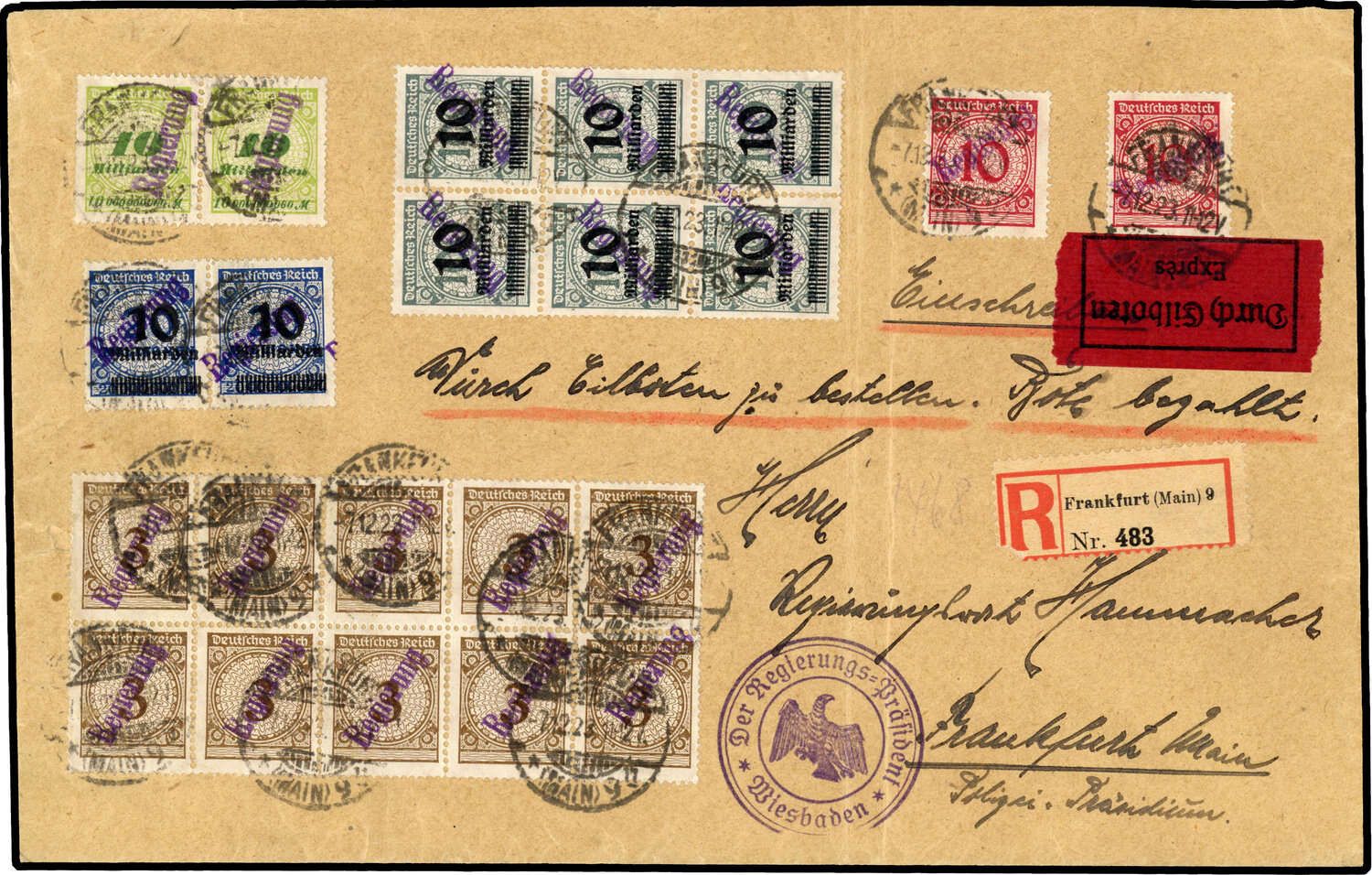 Deutsches Reich Dienst Regierung Frankfurt:1923, 10 Milliarden (MiNr.9 - 2 Stück), 10 Milliarden (MiNr.10 - 2 Stück), 10 Milliarden (MiNr.12 - 6 Stück alle mit kopfstehendem Aufdruck) Inflationsmarken "Rosettenmuster" und 3 Pfg. (MiNr.15 - 10 Stück) und 10 Pfg. (MiNr.17 - 2 Stück) Weimar "Rosettenmuster" alle mit Dienst- Kontrollaufdruck von Frankfurt als portogerechte Mischfrankatur auf Eilboten- Einschreibebrief. Aktuelles Farbfotoattest Weinbuch BPP vom 25.04.2017 "... echt.... Der Umschlag hat einen senkrechten Faltbug und weist übliche geringe Verfärbungen und Beförderungsspuren auf. Die Marken befinden sich in einwandfreier Qualität. Belege in dieser Form sind selten und trotz der anzunehmenden Entstehung im Sammlerinteresse eine Besonderheit der Inflationszeit... ". Das auf dem sogenannten "Dezemberbrief" verklebte Porto betrug nach dem damaligen Umrechnungsmodus 60 Reichspfennig!