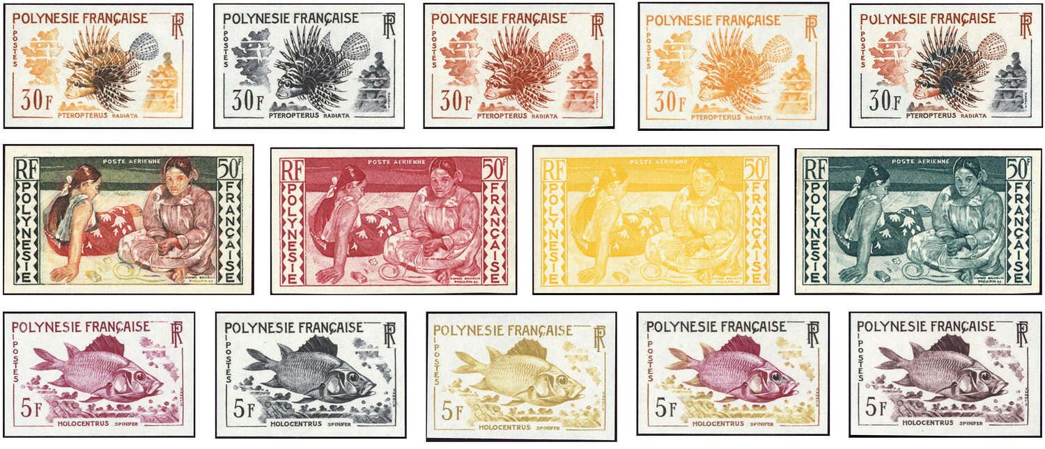 FRANZÖSISCH POLYNESIEN: Schöne Sammlung von 30 Ausgaben mit insgesamt über 220 verschiedenen ungezähnten Farbproben postfrisch ab den guten 60-er Jahren die alle im Stichtiefdruck hergestellt wurden. Beinhaltet sind auch noch tolle thematische Themen wie Fischerei, Flugzeuge, Gemälde, Olympiade usw.. Eine tolle Ozeanien- Sammlungsergänzung!