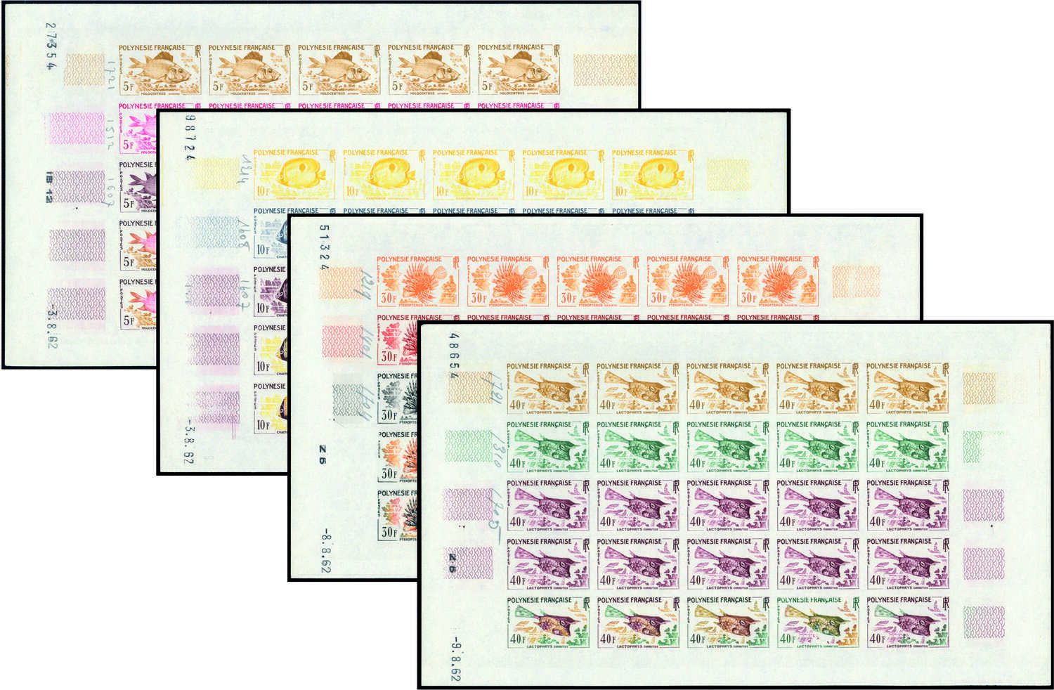 FRANZ. POLYNESIEN: 14 komplette Original- Druckbögen ungezähnt postfrisch mit insgesamt 350 einzelnen Farbproben von diesem ausgefallenen Gebiet im Stichtiefdruck ab den 50-er Jahren. Die seltenen Druckbögen weisen alle das gesuchte Druckdatum auf und zudem noch zum Teil Randbedruckungen und handschriftliche Vermerke des Druckers. Dabei auch gute thematische Ausgaben vorhanden, wie z.B. Fische u.a.. Optisch eine tolle Bereicherung jeder Französisch Polynesien- Sammlung!
