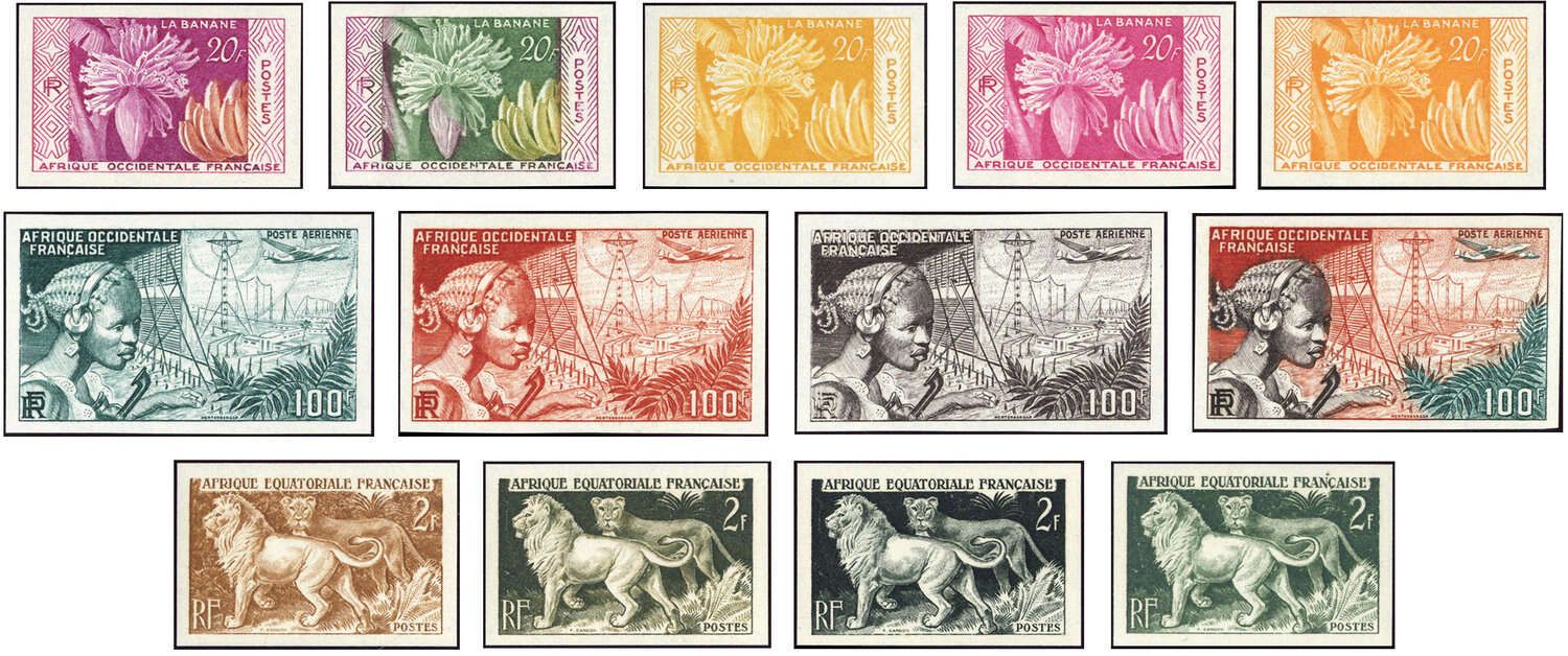 FRANZÖSISCH WESTAFRIKA/ÄQUATORIALAFRIKA : Schöne Sammlung von 21 Ausgaben mit insgesamt über 140 verschiedenen ungezähnten Farbproben postfrisch aus den 50-er Jahren die alle im Stichtiefdruck hergestellt wurden. Beinhaltet sind auch noch tolle thematische Themen wie Früchte, Tiere, Flugzeuge, Schiffe usw.. Eine tolle Afrika- Sammlungsergänzung!