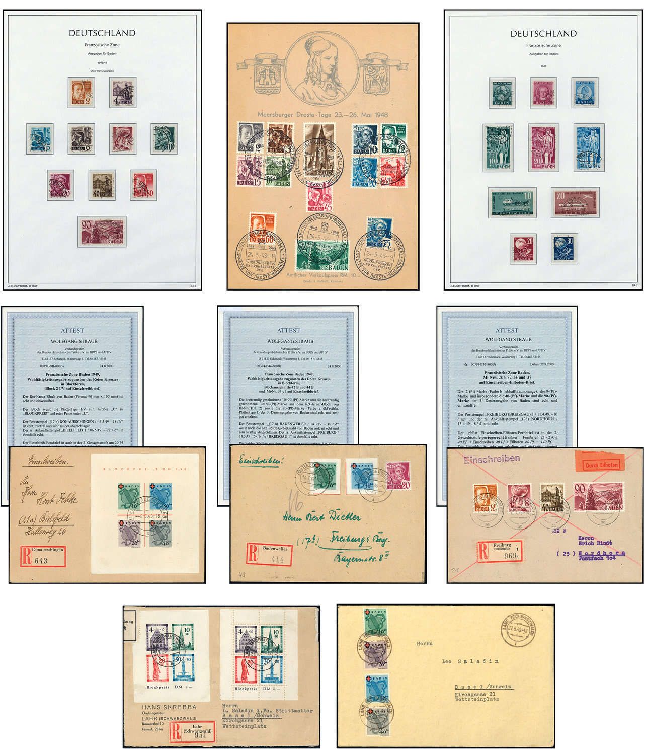 FRANZÖSISCHE ZONE ALLGEMEINE AUSGABE/BADEN: Nach Hauptnummern komplette sauber gestempelte Sammlung. Die Blockausgabe Rotes Kreuz ist fast zentrisch gestempelt auf Einschreibebrief in der Type "I" vorhanden, Farbfotoattest Straub BPP " ... echt und einwandfrei ..." . Weiterhin die 10 und 30 Pfg. Blockeinzelmarke zusammen mit Zusatzfrankatur auf portogerechtem Einschreibebrief und ebenfalls Farbfotoattest Straub BPP " ... sehr gut erhalten ...". Das Freiburg- Blockpaar sowie der Rot- Kreuz- Satz sind ebenfalls auf Briefen gesammelt worden. Ein gepflegtes Objekt!
