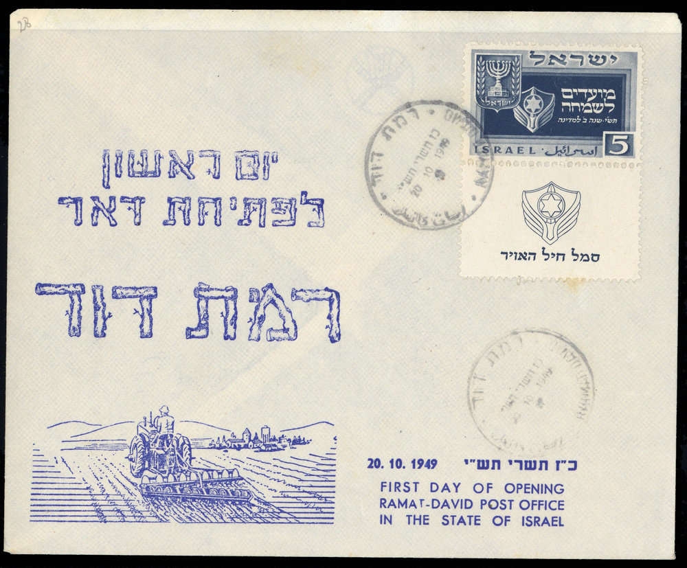 "RAMAT-DAVID 20 10 1949", K1 auf Eröffnungs-Schmuck-Umschlag mit 5 (Pr) Luftwaffe, Halftab, Altersspuren